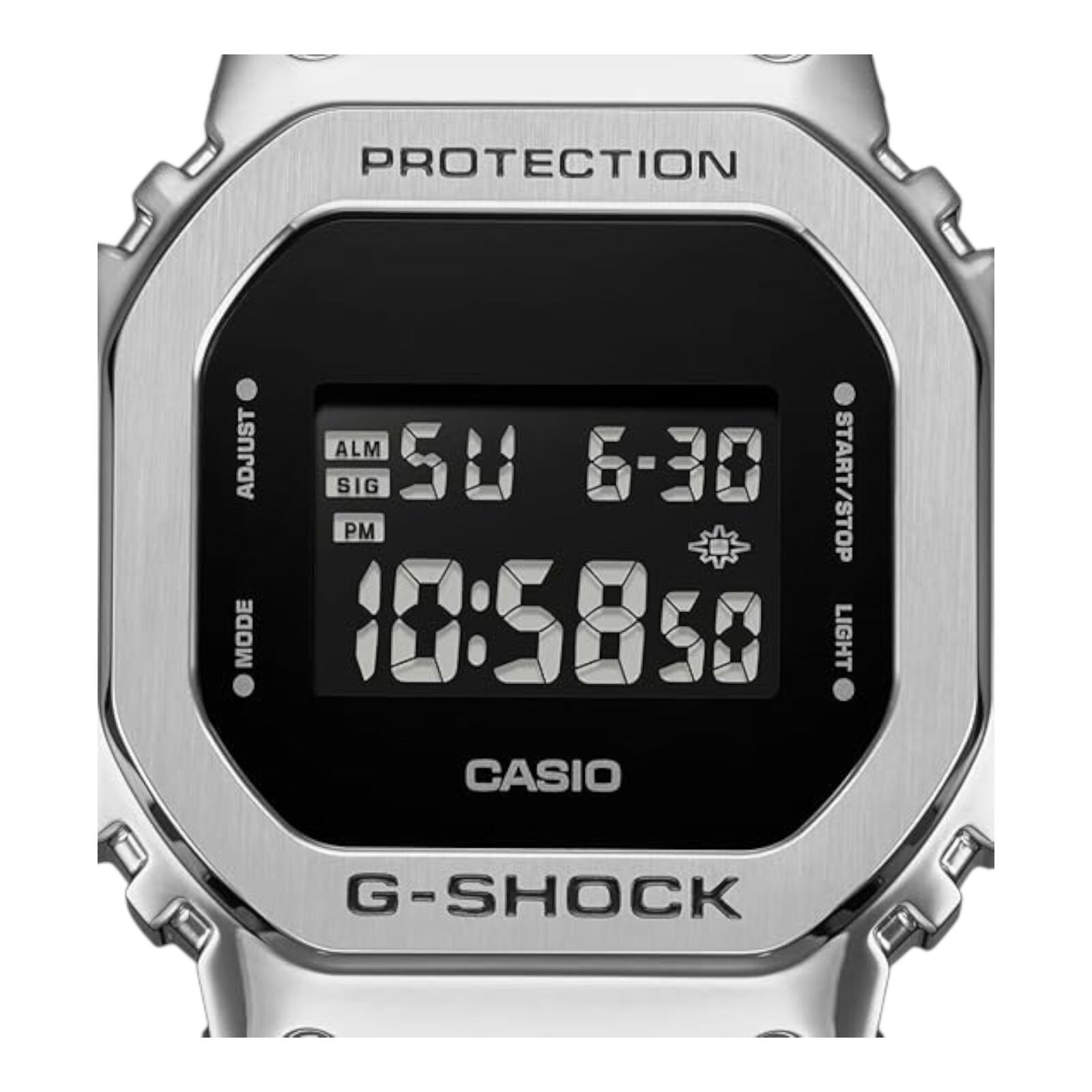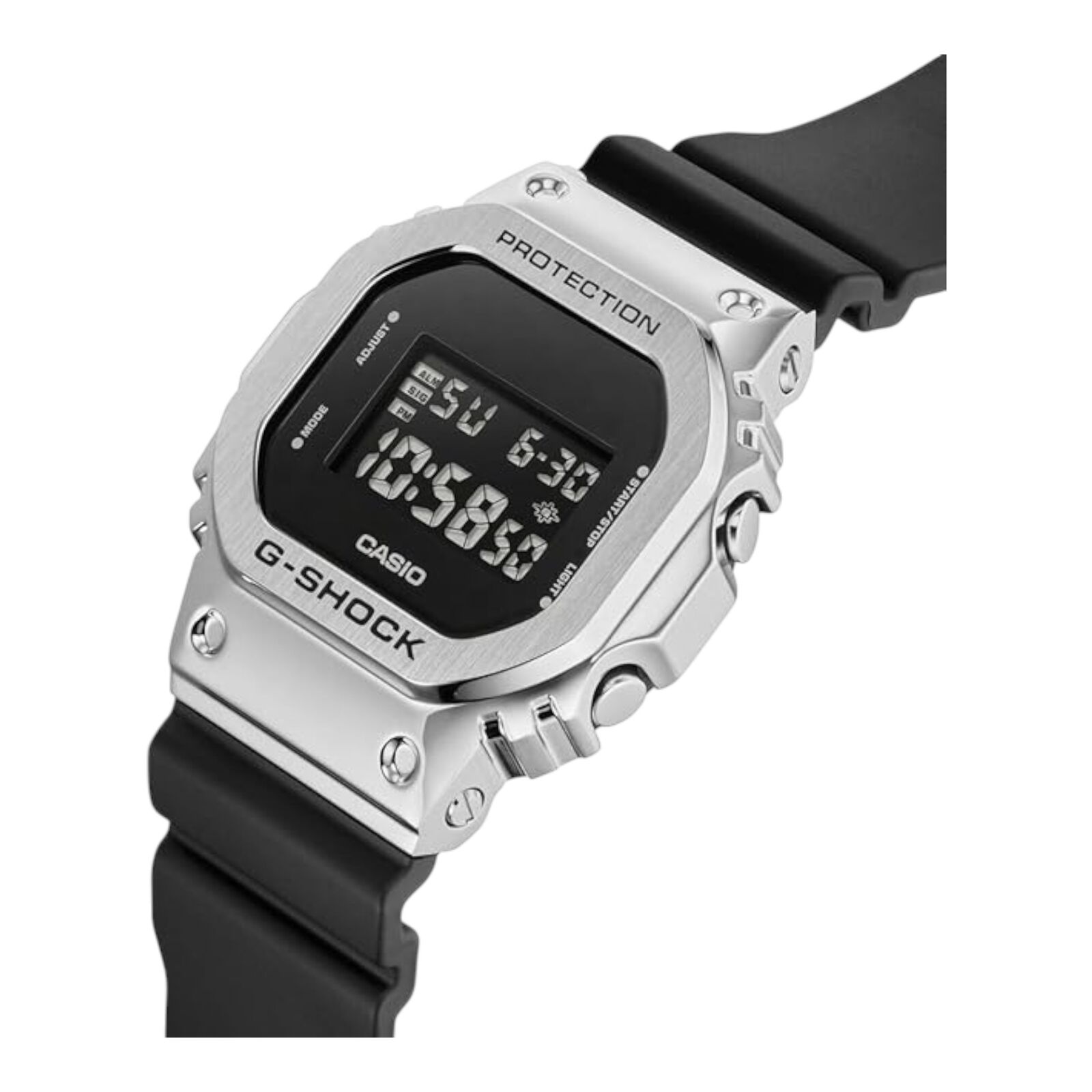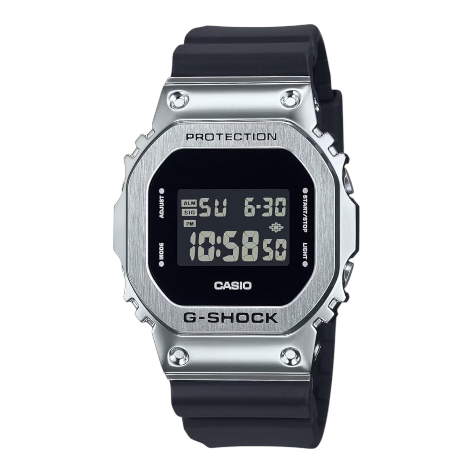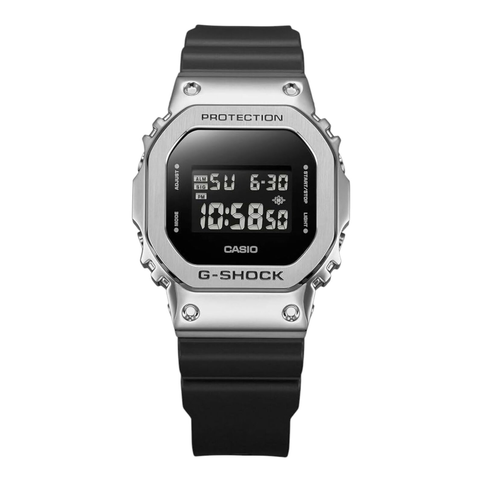 The Casio GM-5600U-1DR evolves the iconic square G-Shock with a refined metal twist. Featuring a stainless steel bezel over a shock-resistant resin case, this model combines premium feel with lightweight comfort. Its inverted LCD and bold black design keep it both modern and true to G-Shock heritage.