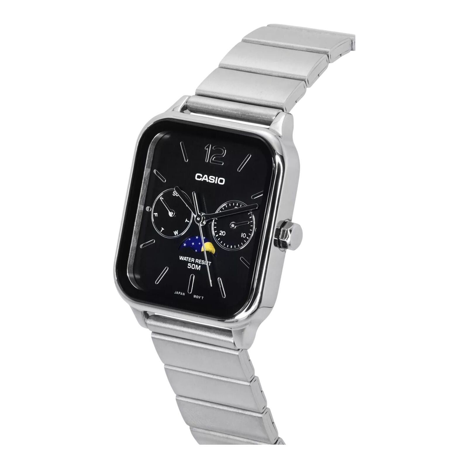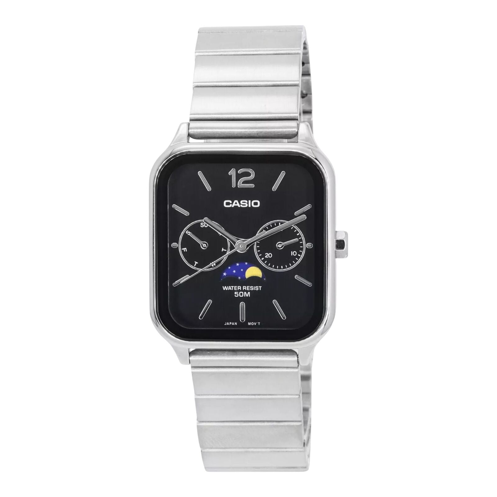 The Casio MTP-M305D-1AV blends sleek sophistication with a touch of lunar elegance. Featuring a detailed black dial with moonphase, day, and date sub-dials, this stainless steel timepiece is built for everyday wear and stylish functionality.
