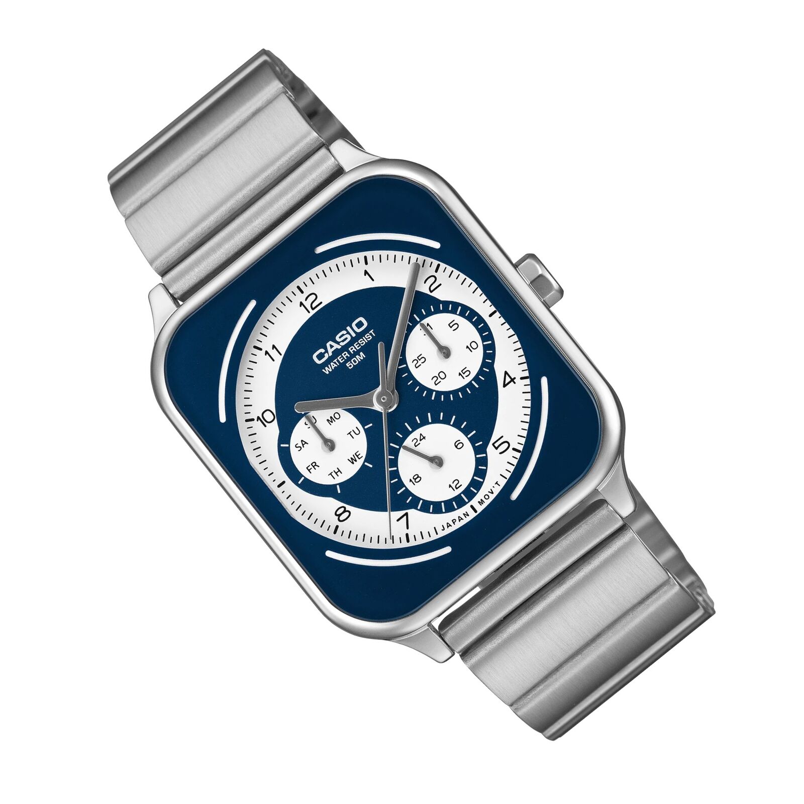 The Casio MTP-M307D-2BV is a reliable and stylish men's watch featuring a deep blue dial and three handy subdials for day, date, and 24-hour time. With a durable stainless steel band and 50-meter water resistance, it's a practical choice for everyday wear with a sharp modern edge.