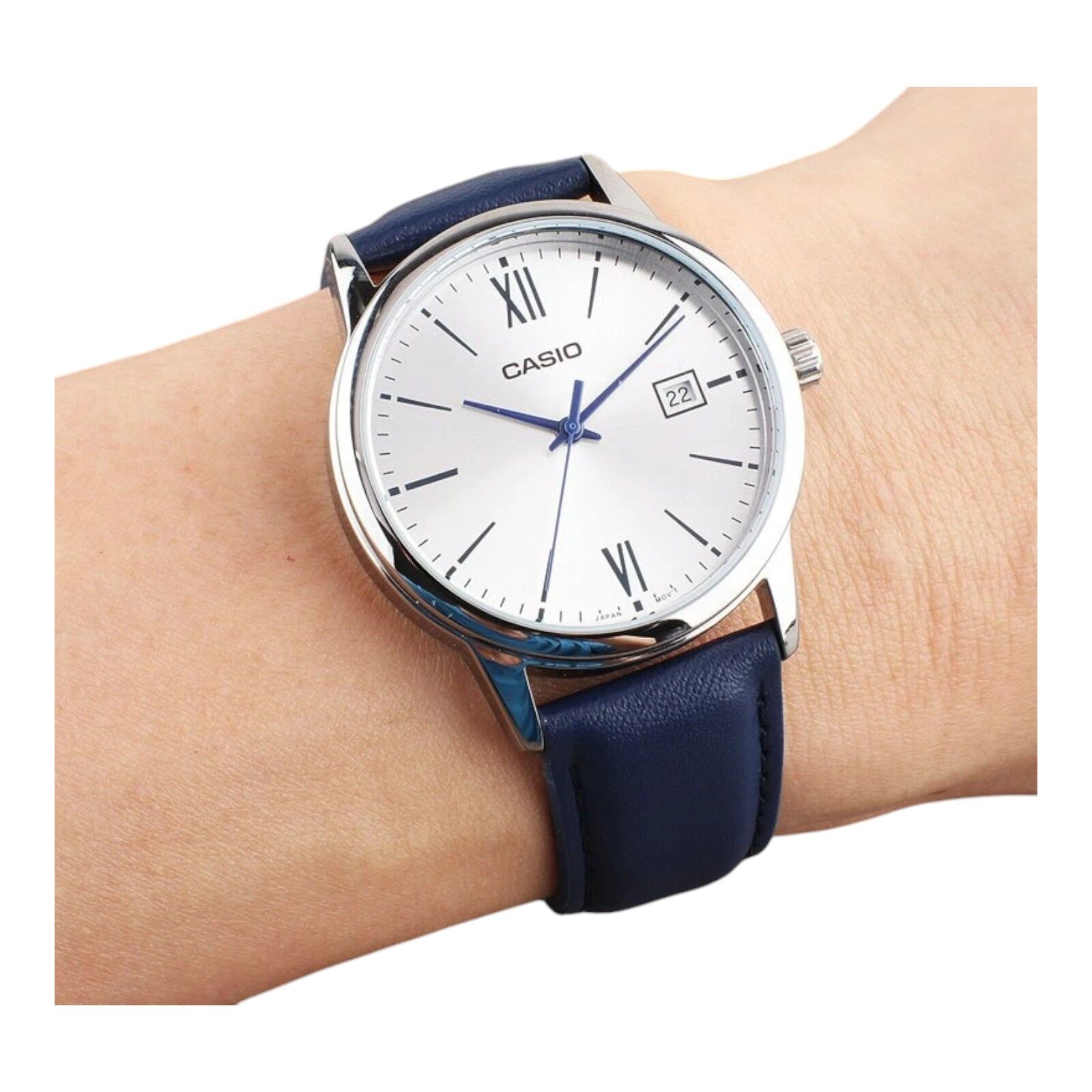 Style yourself for work or play with the Casio MTP-V002L-2B3 — a sleek and versatile timepiece that brings a refined touch to your daily wear. With its clean silver-tone dial, classic Roman numeral markers, and striking blue leather band, this watch offers timeless elegance backed by everyday practicality.