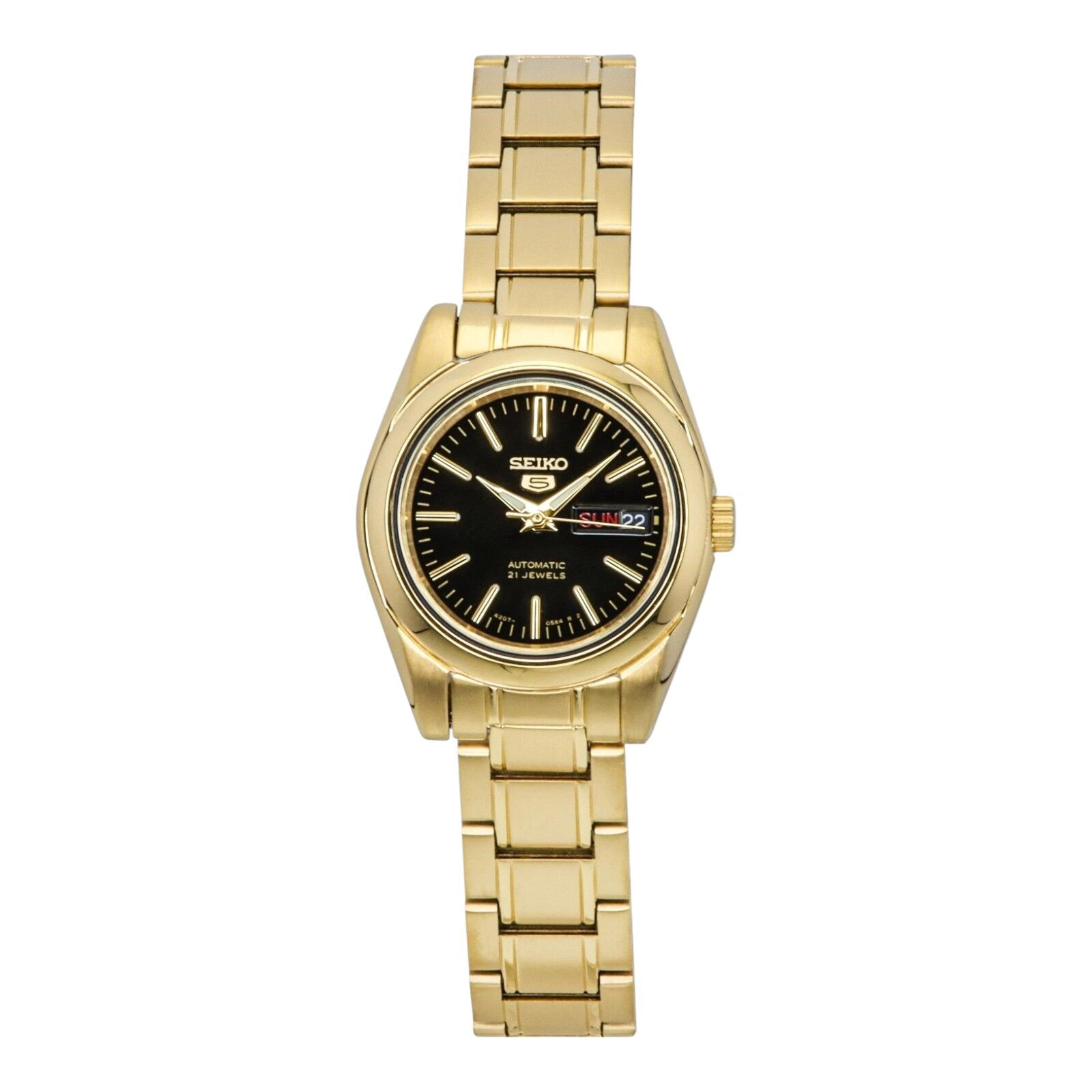 The Seiko SYMK22K1 offers a sleek black dial paired with a full gold-tone finish for a bold, elegant look. Featuring automatic movement, a compact 27mm case, and day-date function, this timepiece balances classic appeal with everyday practicality.